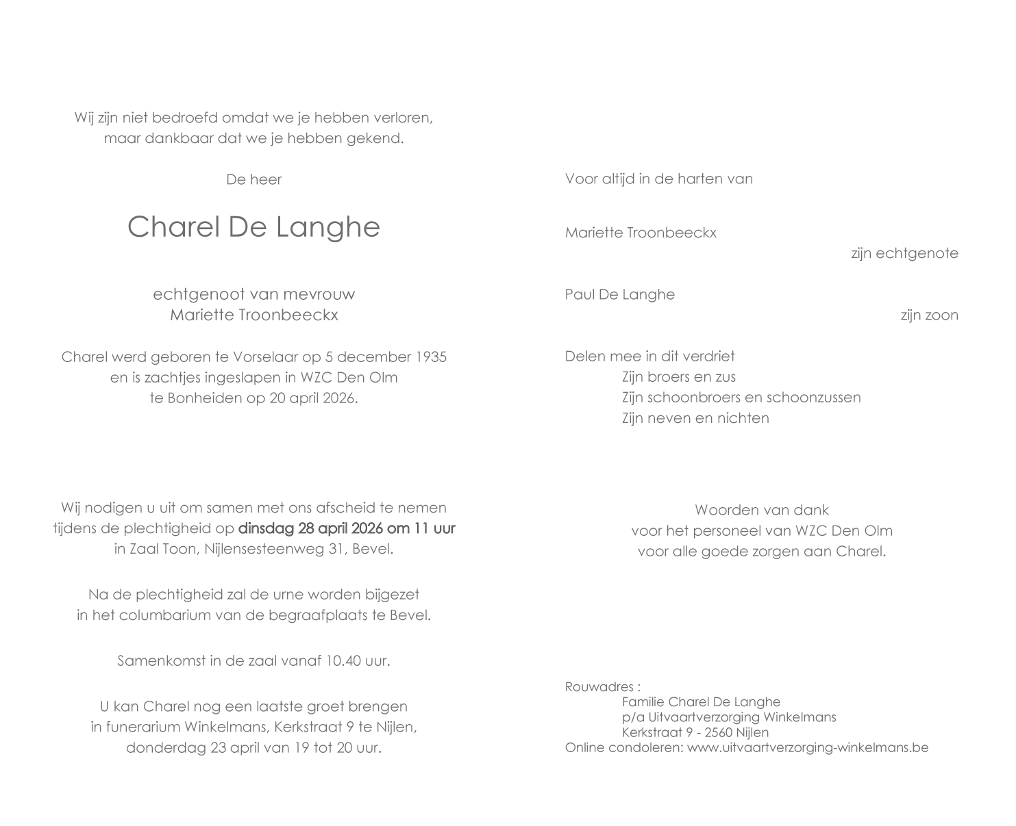 Overlijdensbericht van Meneer Charel De Langhe