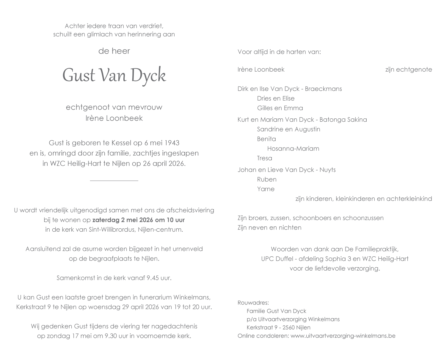 Overleden te Nijlen (2560) op zondag 26 april 2026 op 82-jarige leeftijd