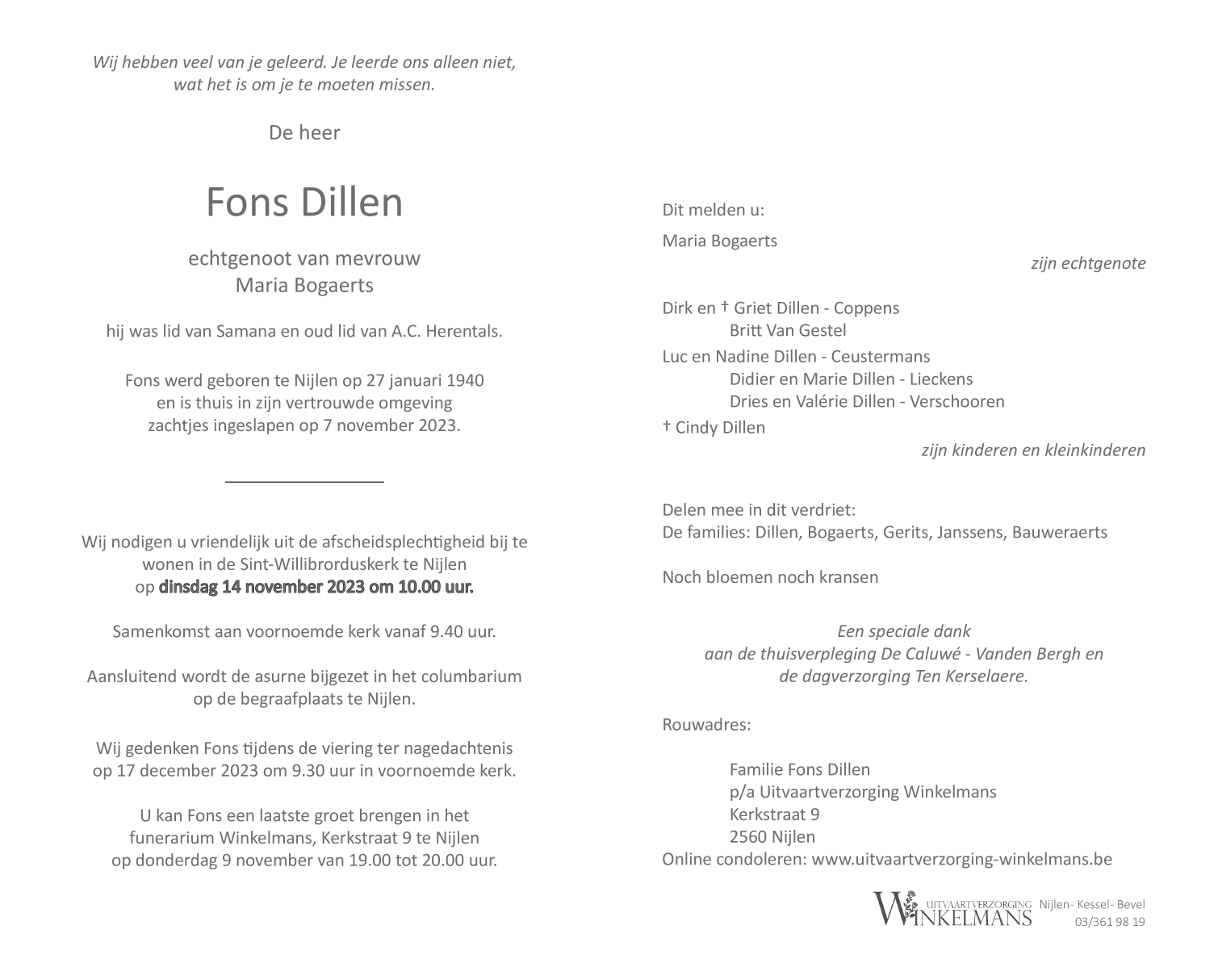 Overleden te Nijlen (2560) op dinsdag 7 november 2023 op 83-jarige leeftijd