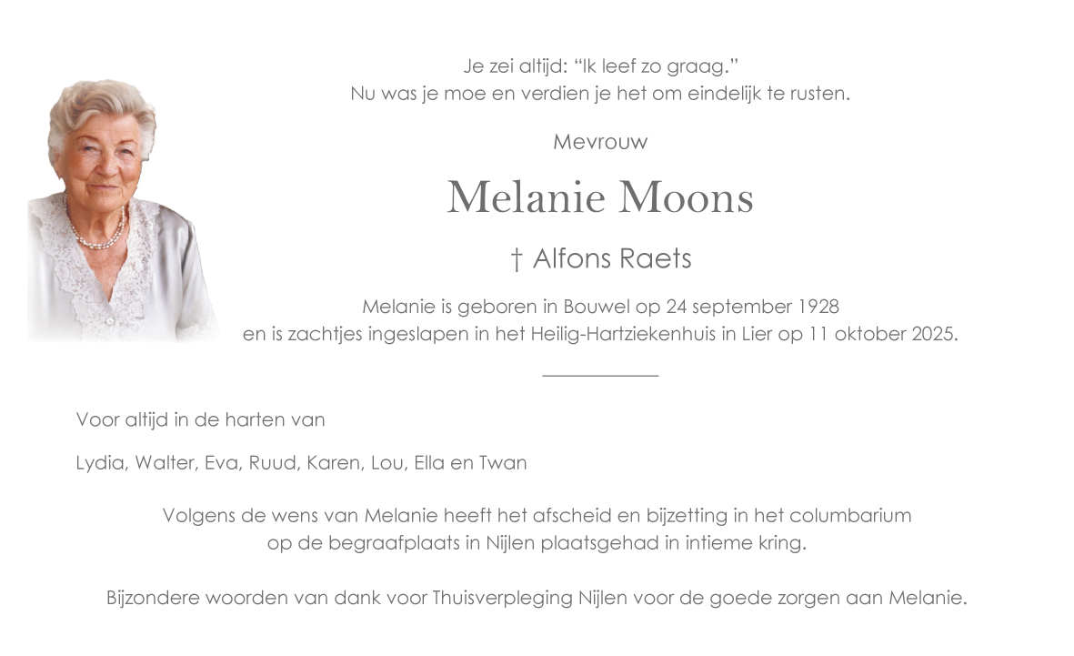 Overleden te Lier (2500) op zaterdag 11 oktober 2025 op 97-jarige leeftijd