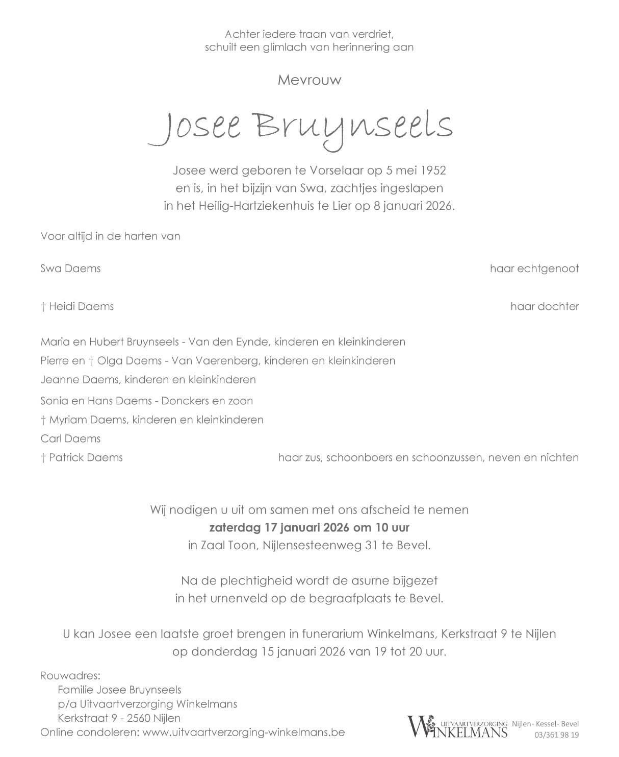 Overleden te Lier (2500) op donderdag 8 januari 2026 op 73-jarige leeftijd
