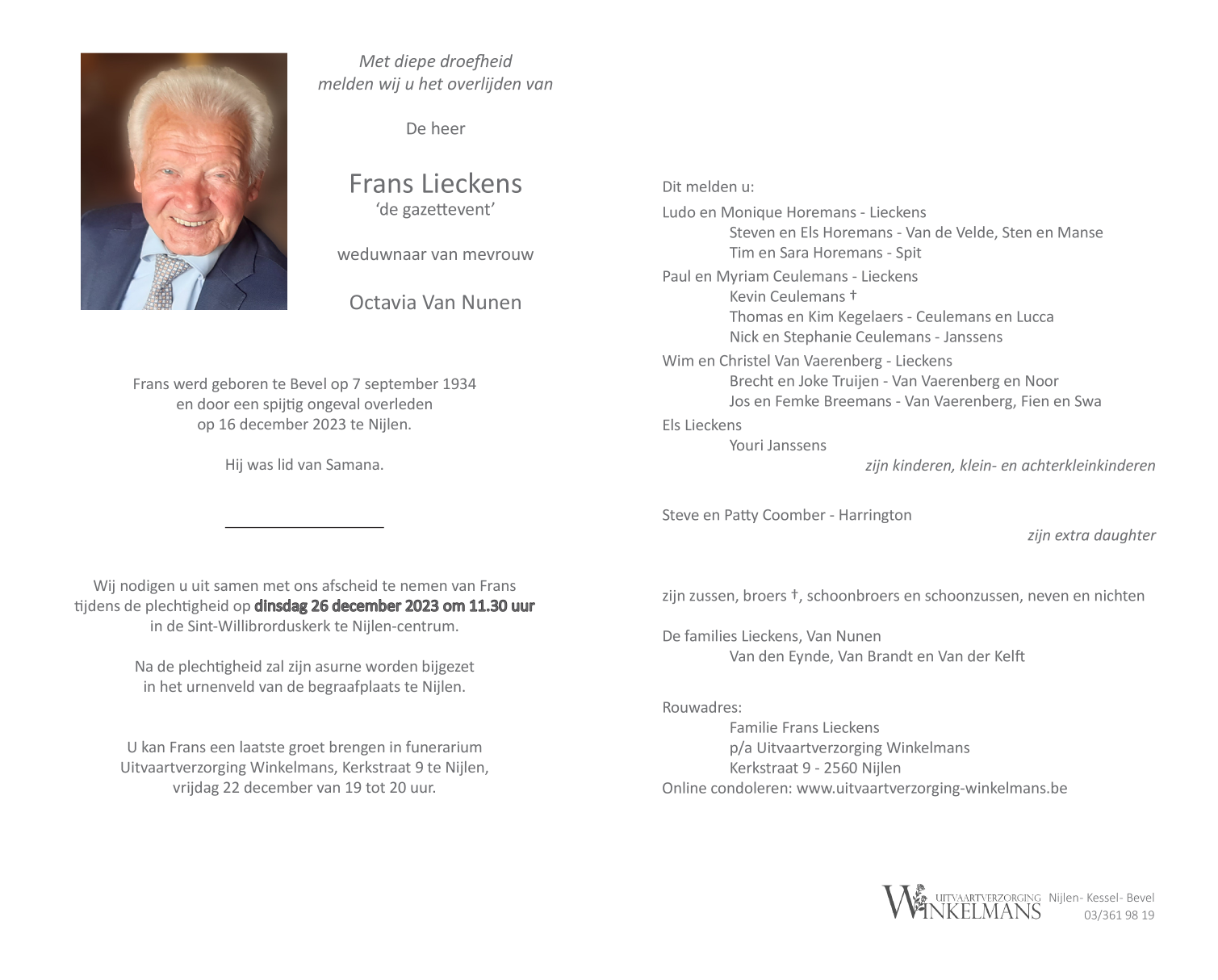 Overleden te Nijlen (2560) op zaterdag 16 december 2023 op 89-jarige leeftijd