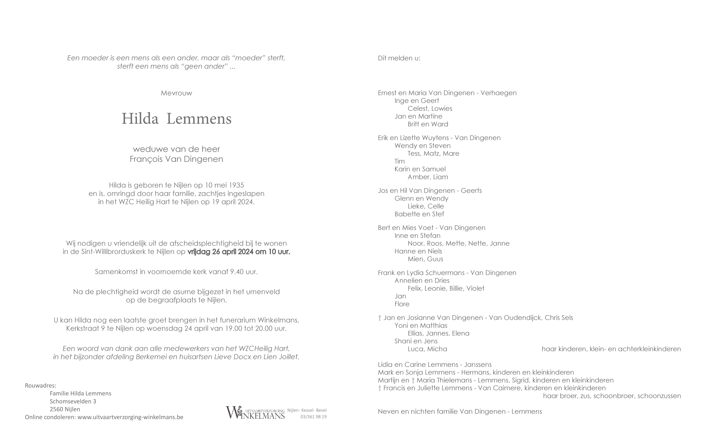 Overleden te Nijlen (2560) op vrijdag 19 april 2024 op 88-jarige leeftijd
