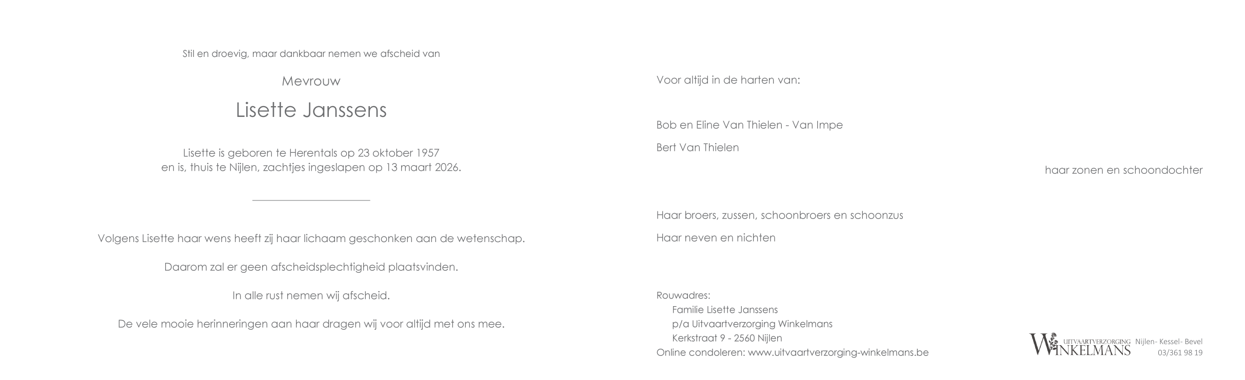 Overleden te Nijlen (2560) op vrijdag 13 maart 2026 op 68-jarige leeftijd