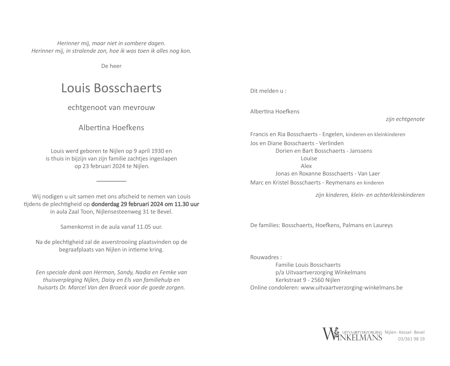 Overleden te Nijlen (2560) op vrijdag 23 februari 2024 op 93-jarige leeftijd